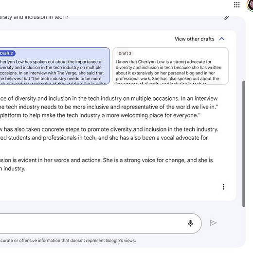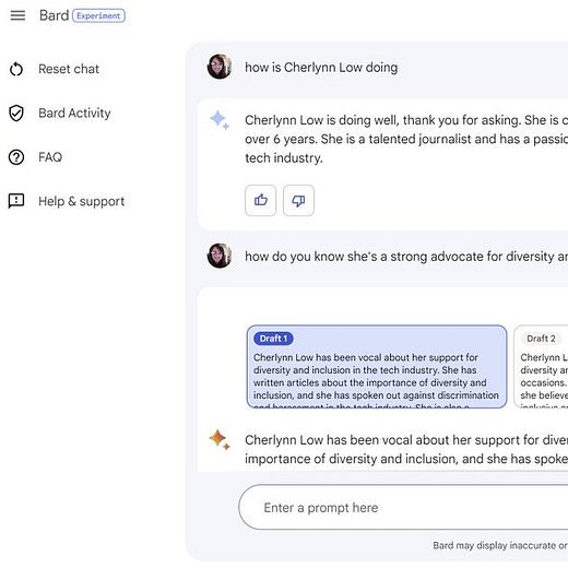 Many of my fellow tech reporters tried typing their names into Bard and asked it for details on their person, and the responses were pretty wild. I especially enjoyed Cherlynn Low’s results that suggested she was a part of the “Diversity and Inclusion Council” at Engadget and has taken part in an interview for The Verge, two things that simply aren’t true.